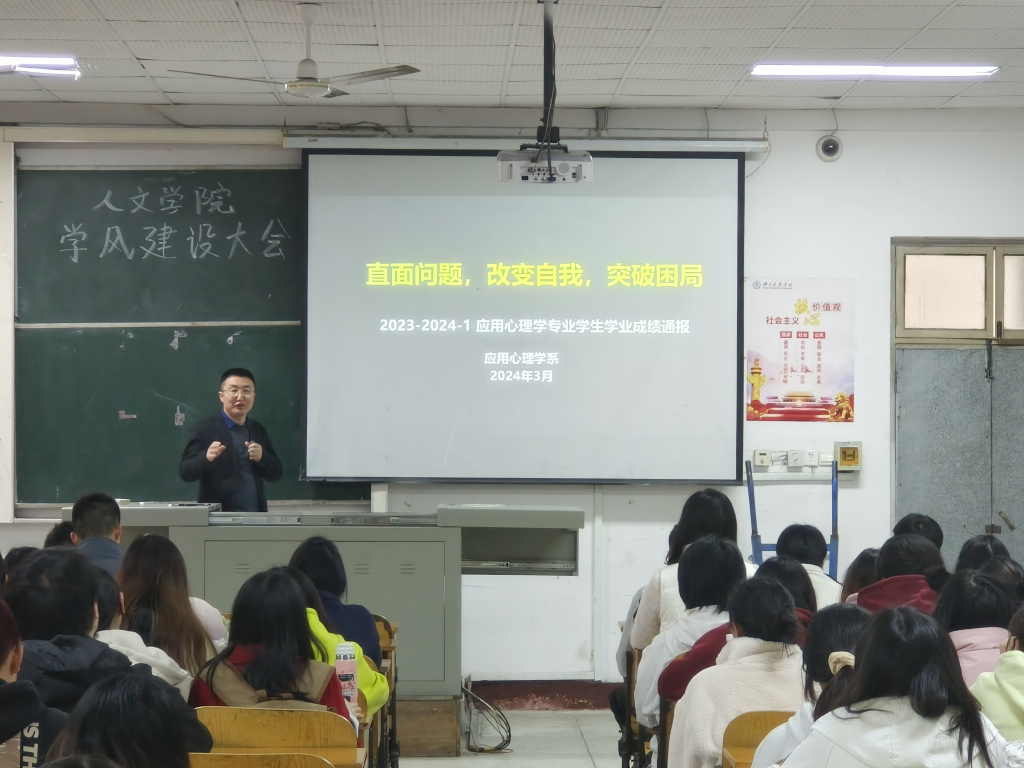应用心理学系主任柴晓运首先对上学期期末各年级专业课考试情况进行了通报和分析,对本学期专业课的学习提出更严格的要求,还给同学们解读了应用心理学专业本科生应该具备的七大素养,要求同学们直面问题,改变自我,突破困局。