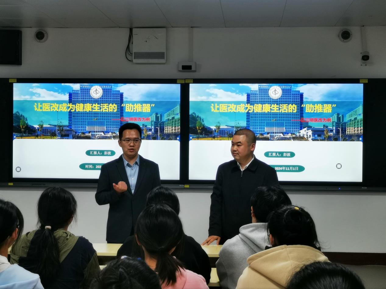 在讲解三明医改的实施路径时,彭老师强调了全局视野和多方合作的必要性,提到“医改不仅仅是医疗领域的问题,它还涉及到社会经济结构、政府政策导向以及公众健康素养等多个方面的协同推进。”他呼吁同学们要充分认识到,作为未来的医学生或医疗行业从业人员,医改不仅仅是专业知识的应用问题,更是对社会责任感和使命感的体现。